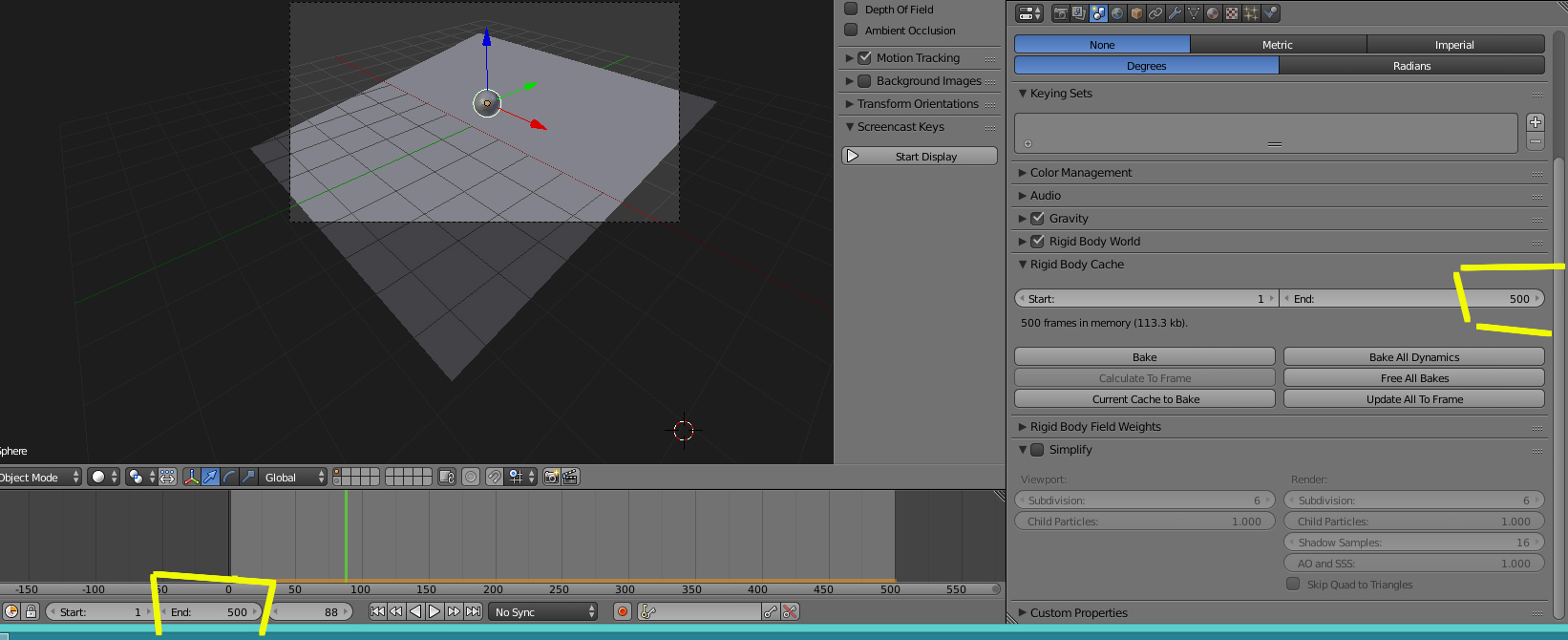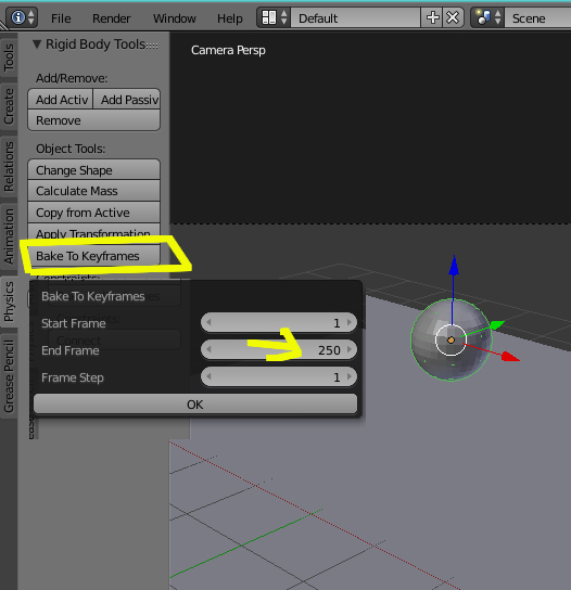 Hola ya hice lo que me dijiste pero cuando hago eso, muchos palitos (key frame) de color amarillo aparecen hasta el key frame 250, luego imaginate que le puse que termine en el key frame 300, en ese lugar solo aparece 1 palito y la animación de la pelota termina en el 250 nada más, se queda rigido, suspendido en el aire ¡Ayudaaa!!!! :( Yo el proyecto de la pelota tengo en otra pc pero solo quiero aprender a solucionar ese problema de los key frame de Rigid Body Tools para luego poder trabajar tranquilamente en el proyecto de la pelota, espero tu respuesta Soliman... T_T