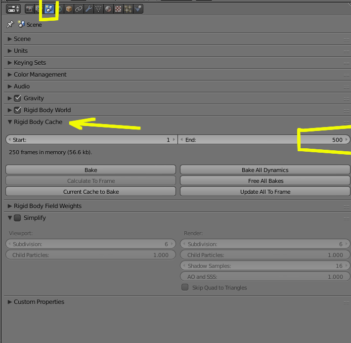 Gracias Soliman, ahora modifique el número de "END" y ahora si funciona correctamente, entonces cada vez que quiera alargar el tiempo de todo ese tema de la física de los objetos solamente tengo que modificar el cache de el "Rigid Body Tools" ¿verdad? no vuelvo a tocar entonces el "Bake To Keyframes" ¿?