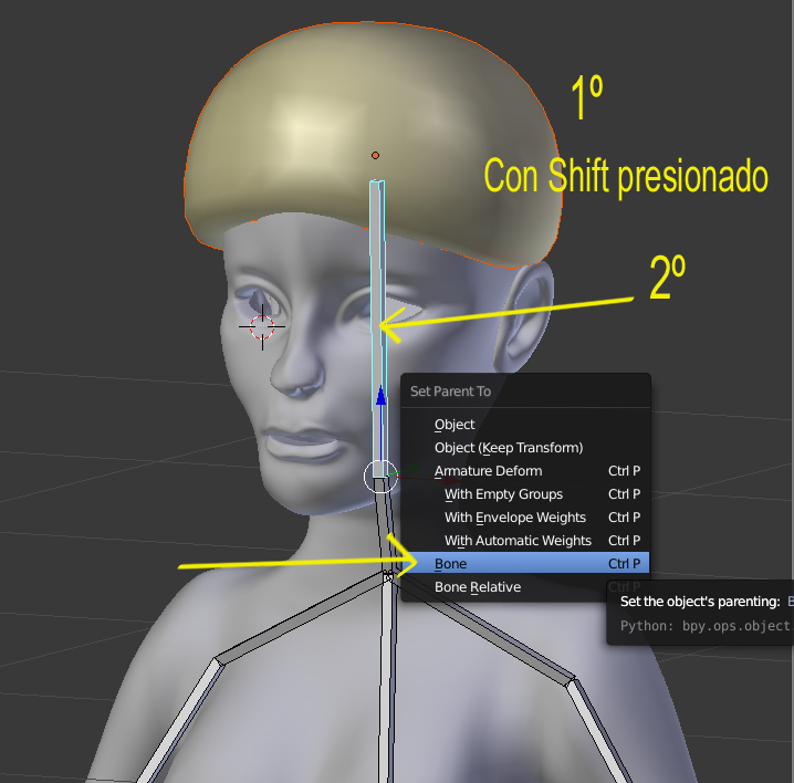 Se selecciona primero el gorro y con Shift presionado, se selecciona la armature, se mira que esté en POSE MODE y se seleccionael BONE (Hueso) donde quieres unirlo.