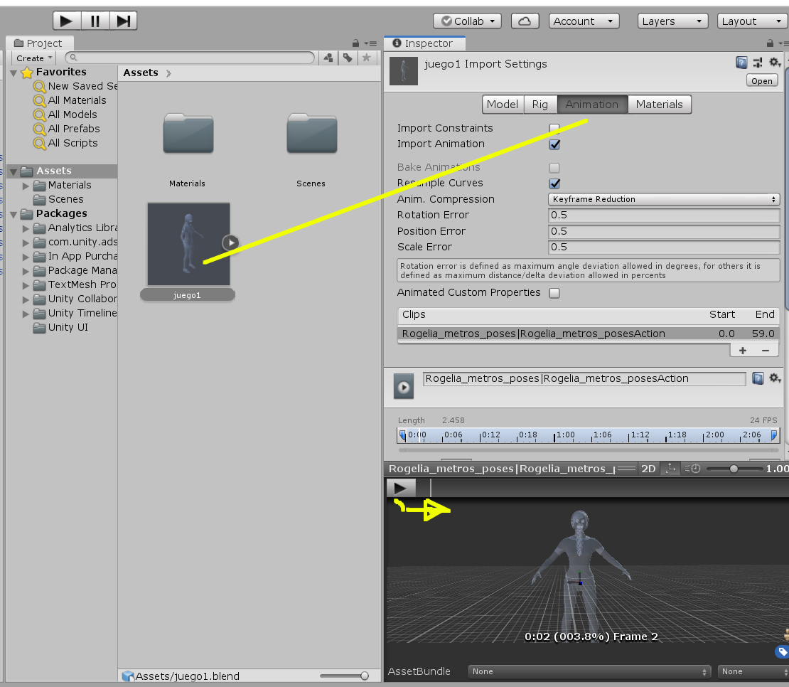 También si meto directamente el archivo blend en unity no hace nada la animación..