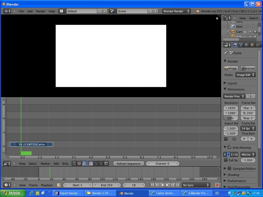 Estoy probando el editor de blender 2.59 y en la pantalla donde debería aparecer el visionador me aparece un cuiadro en blanco. ¿Alguien sabe si es por algún fallo de utilización o es por defecto mi copia del software?