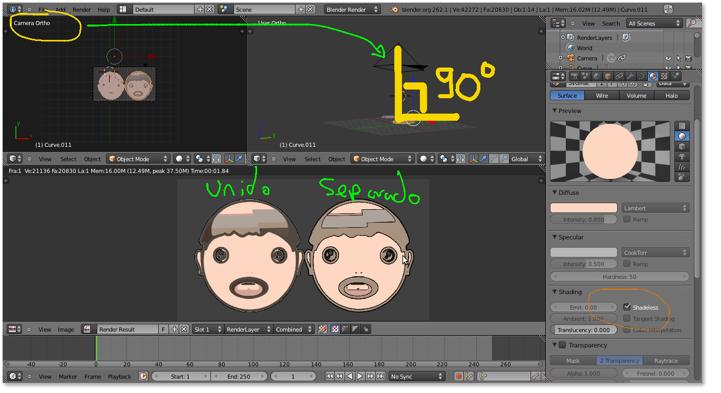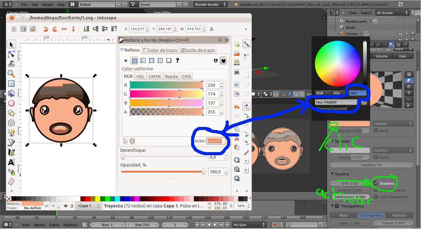 4. en blender si quieres los colores tal cual como 2d solo debes aplicar un material y le colocas el color rgb que usaste y activar el boton shadeless .. ver imagen color