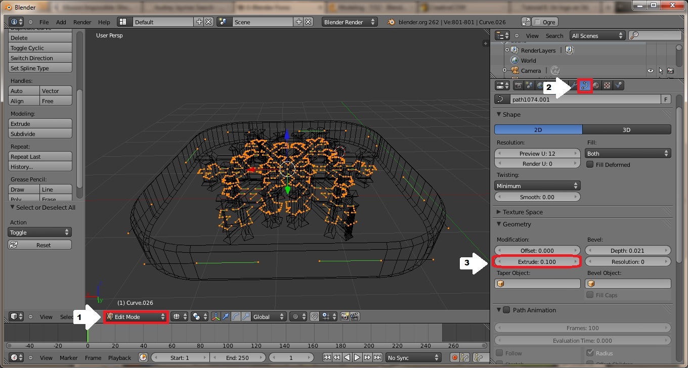 Supongo que cuando entras a modo editar lo que ves son puntos de cada controlador, lo unico que debes hacer para poder extruir es lo siguiente: