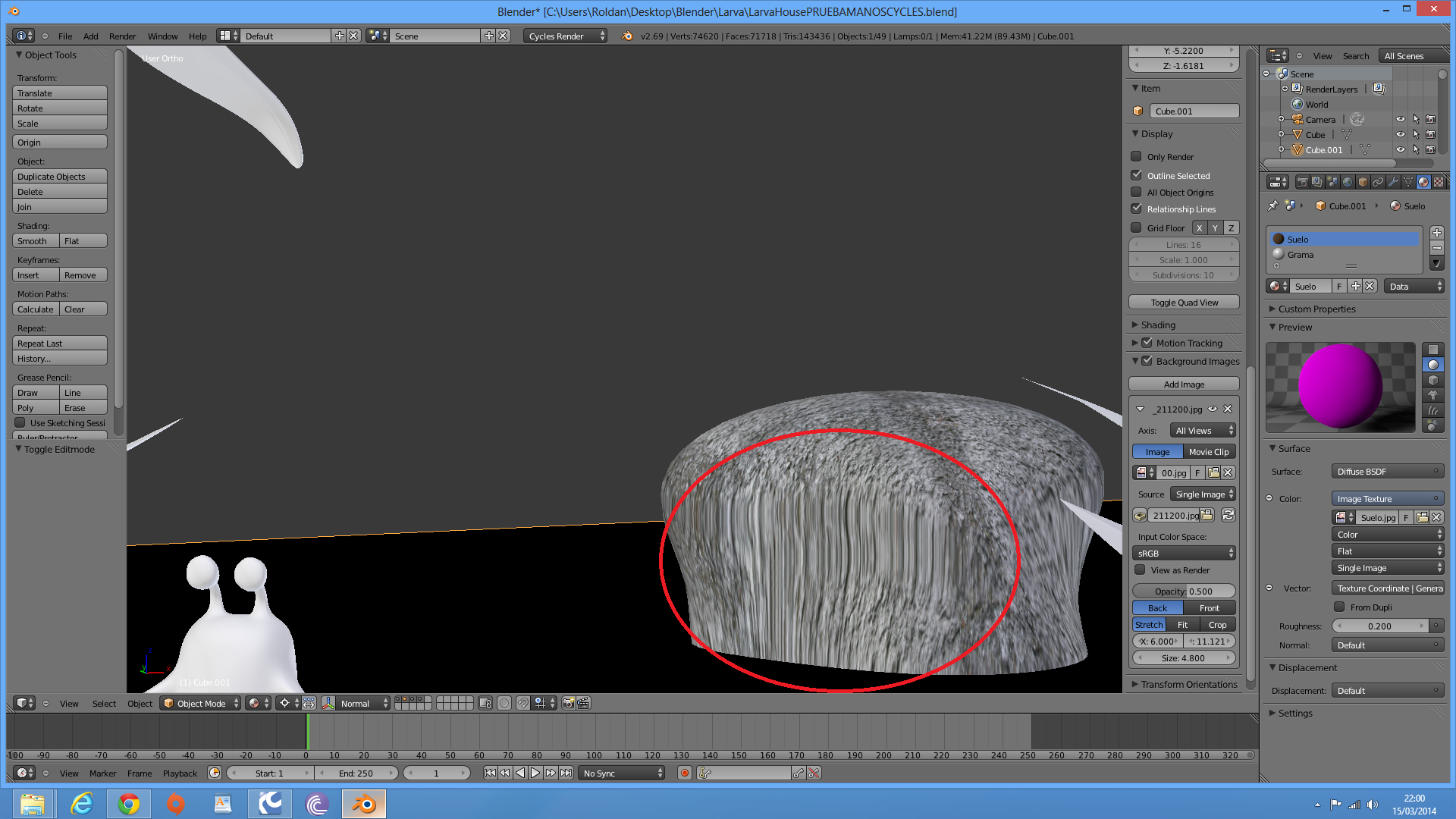 2- veo que usas cycles, repasa los nodos y asegurate de que esta todo bien conectado... y ahora que me fijo, tienes un material \"encima\" del suelo que se llama Gama, eso me parece raro, lo has puesto por algun motivo? puede ser eso..