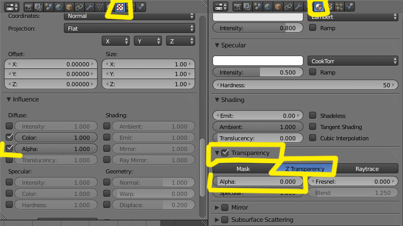 En MATERIAL debes de ponerle la TRANSPARENCY con el APHA a CERO