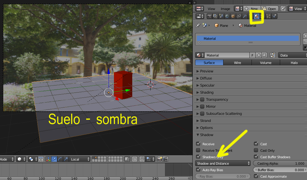 Para la sombra se pone un plano y se marca en MATERIAL > SHADOW > Shadow Only