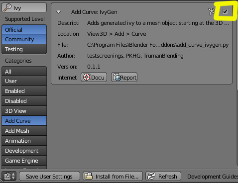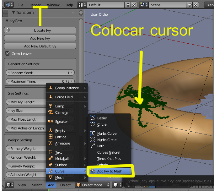 Solo hay que activarlo desde User Preferences y luego colocar el cursor sobre uno de los vértices del objeto, se entra en Object Mode y se añade desde ADD > Curve > Add Ivy to Mesh