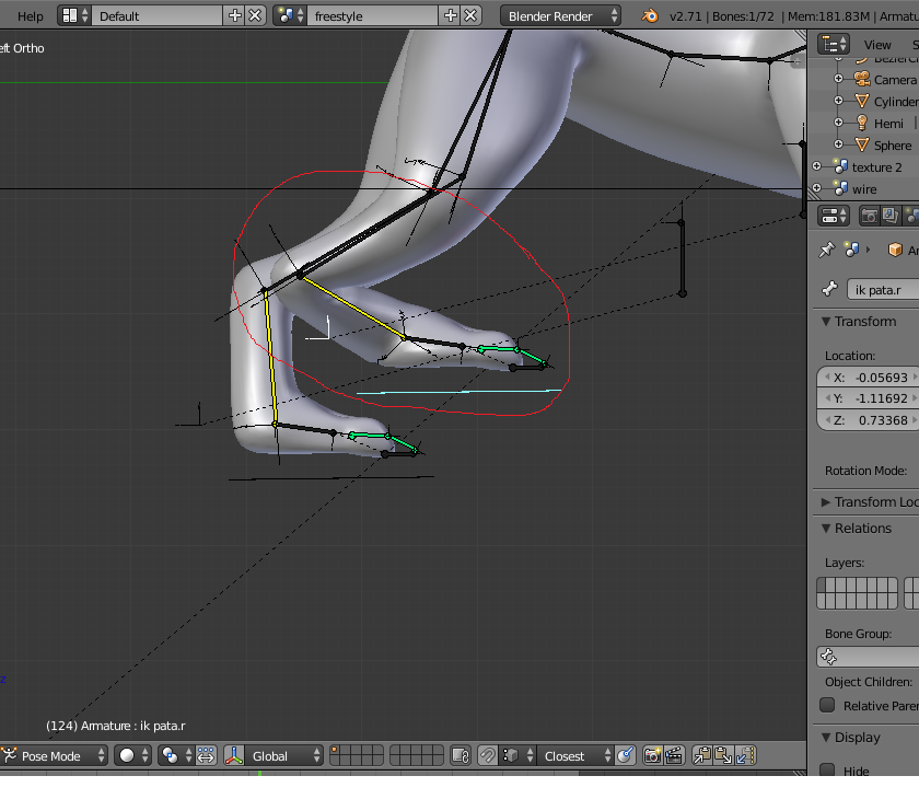Sobre lo de la pata del animal, nunca he probado con ese tipo de pierna, pero sería bueno que puesiera una captura de la armature, donde tienes el IK, si los huesos los tienes conectados (conected) o no, etc.