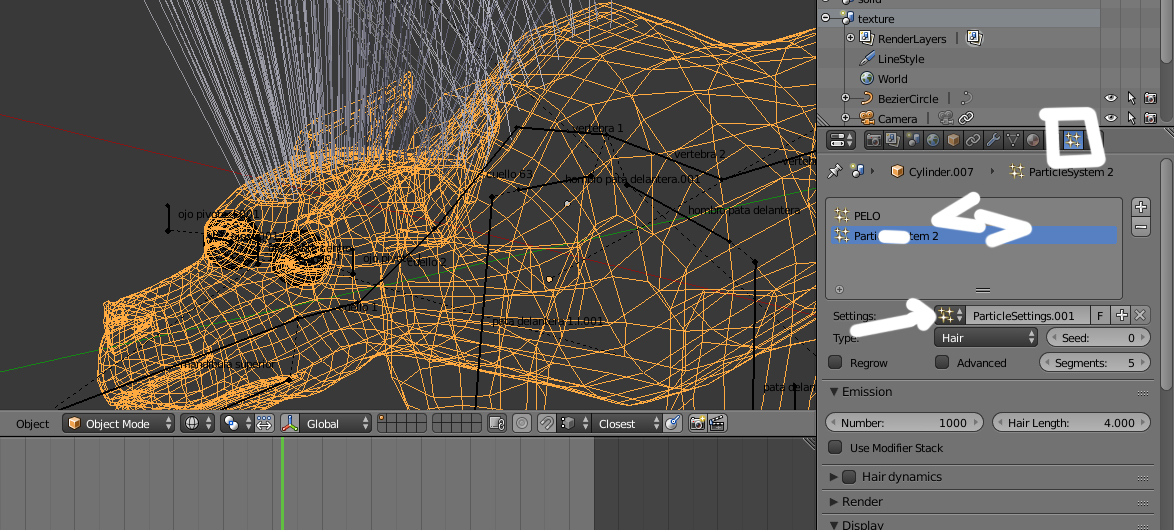 Se pueden utilizar las partículas de pelo que tenías antes o de otro objeto.. solo te vas a Particles y tiene que haber una lista con todas las que hayas creado.