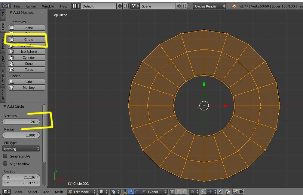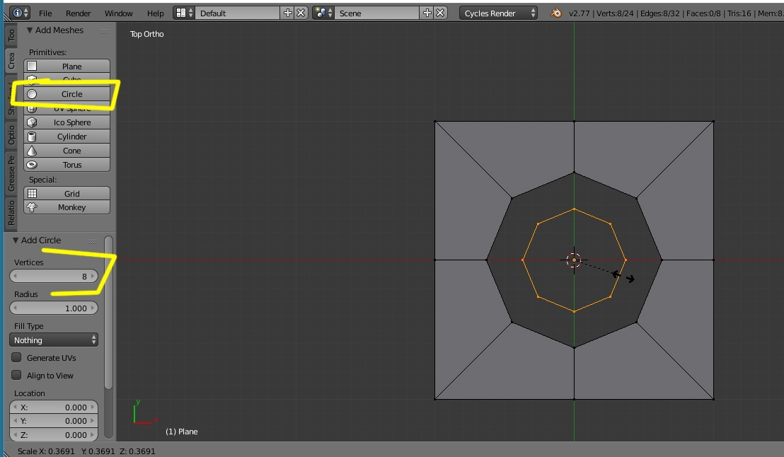 Luego dentro de ese plano creas un circulo de 8 vértices (los mismos que tiene la subdivisión del plano).