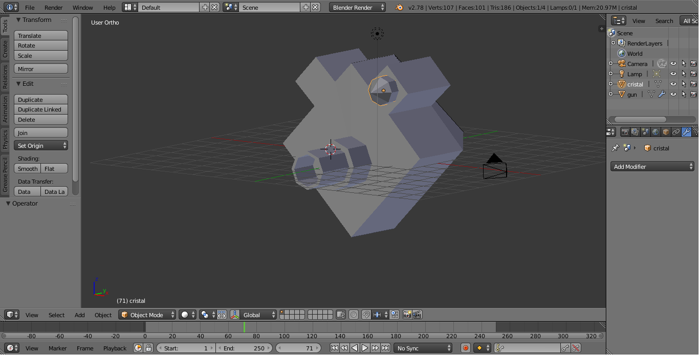 Para los cristales, coloque el pivote en el centro de plano (0,0,0) y luego aplique sobre el cristal un modificador de espejo y luego uni los objetos con Ctrl + J