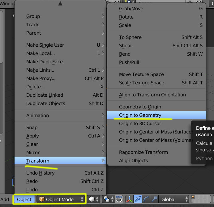 Luego vas a Object > Transform > Origin to Geometry