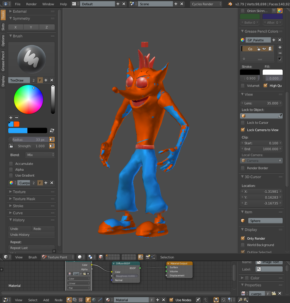 Hola, tengo un problema. Apenas estoy aprendiendo a utilizar el Blender y la funcion de Texture Painting, pero ocurre algo, que cada vez que intento pintar el pantalon en este caso (de azul), al mismo tiempo se pinta el cuerpo arriba, asi como muestran las imagenes. No sé si tengo alguna funcion activada que no va, o algo así. Actúa como si estuviese alguna funcion de simetria activada, pero verifique el symmetry y esta apagad, y el mirror que le aplique al modelo yo ya le di Apply hace rato.