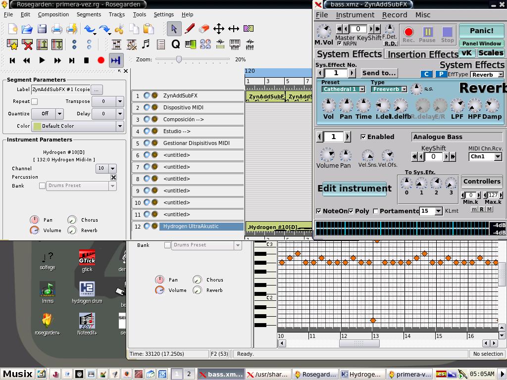 Me lleve una grata sorpresa al ver que todo el soft de audio funcionaba. Porfin pude usar Rosegarden conectado a Hydrogen (drum machine) y ZynAddSubFX (syntetizador) via midi y empezar a hacer algo.