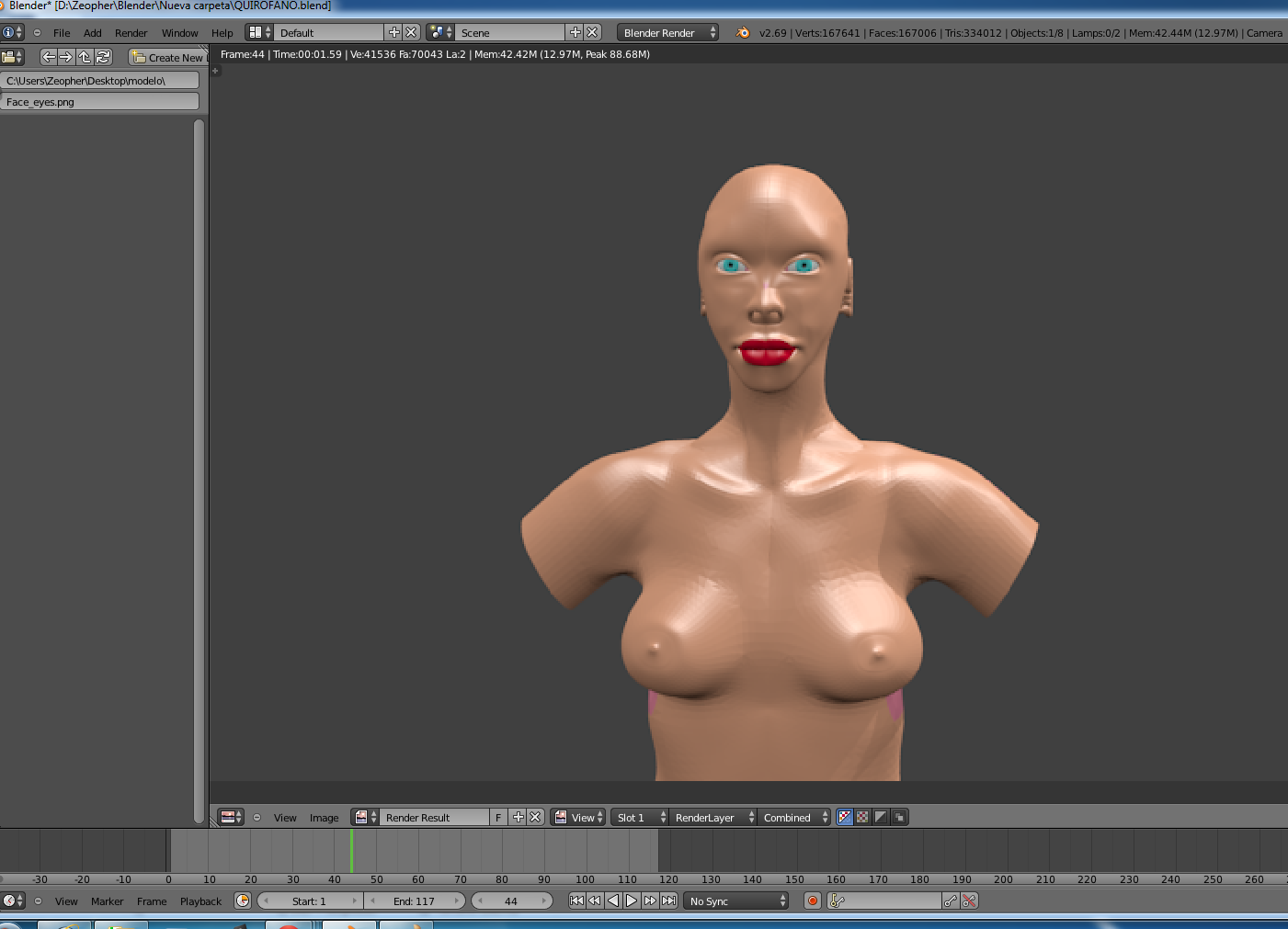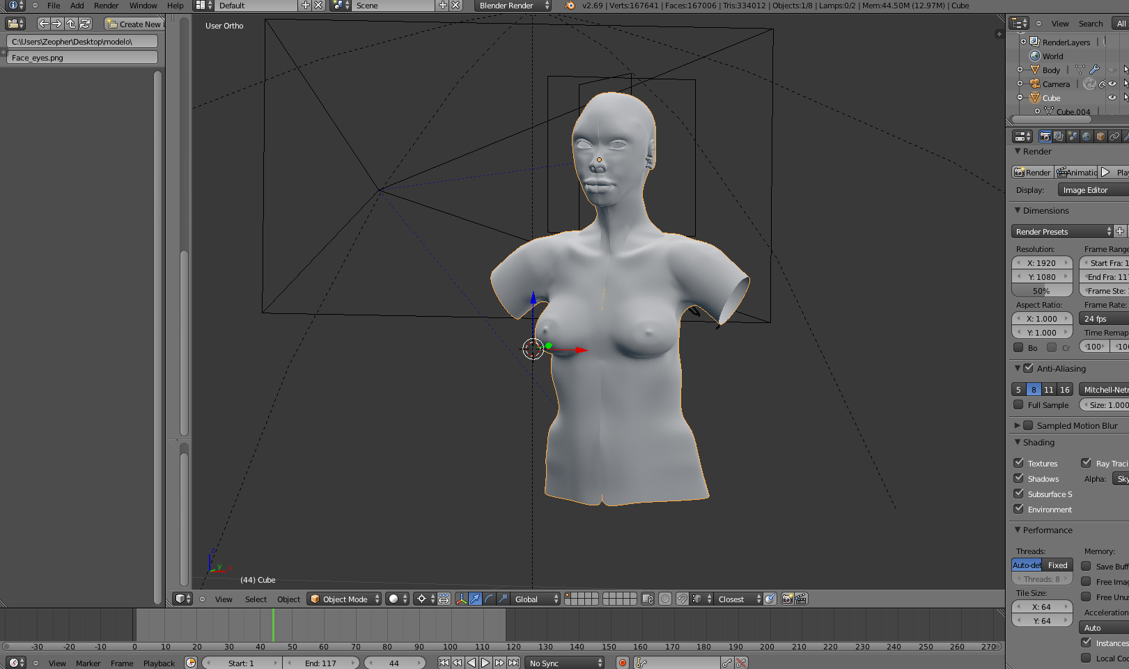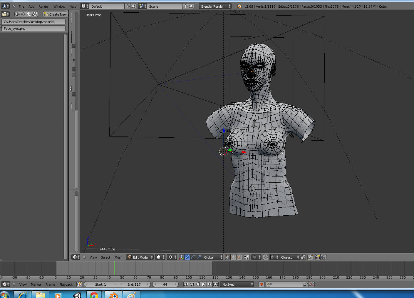 Empecé a hacer un personaje basándome en fotos de una tía que usé como referencia. Primero le hice la cara y fui bajando de ahí hasta pecho y torso, y todo iba bien. Pero ahora tengo un problema. El personaje se ve bien desde Edit Mode y Object Mode, pero, si en Object Mode clico encima de otro mesh, los ojos por ejemplo ( uso un mesh para los ojos y otro para el cuerpo), al personaje le desaparecen vértices en el pecho. Y es algo que no entiendo porque en la vista del Render se ve bien, pero si lo importo a Unity se ve con dichos agujeros en el pecho -.-