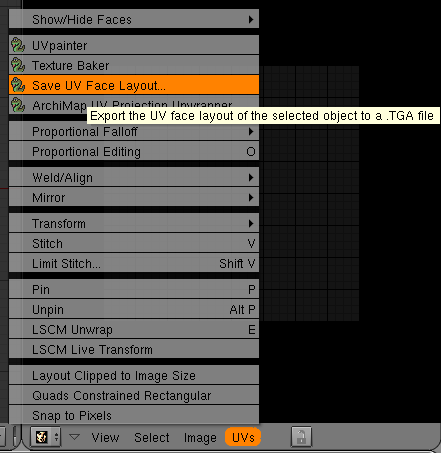 - Una vez que tengo el modelo en 3D y selecciono algunas caras del modelo, le pongo \"u-key\" escojo alguna forma que se le asemeje a las caras que tengo seleccionadas, entonces se crea en la pantalla de \"UV/Image Editor\" las caras de cierta forma, pongo nueva imagen y carga una imagen negra de fondo... La duda es la siguiente: No existe alguna forma de plasmar la cara (Lo que se encuentra seleccionado que aparece parpadeando) en la imagen de fondo, para guardarla y editarlo mas facilmente con el GIMP?