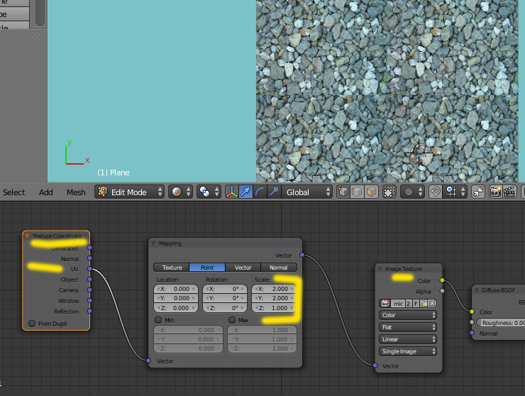Lo segundo: En el caso de Blender Cycles (es diferente en Render Blender) para conseguir el escalado (o sea duplicado) de una imagen, hay que ponerle un VECTOR > MAPPING entre la imagen y las coordenadas de la textura... y ponerle en el valor de Scale el valor que quieras que se repita (en coordenadas X e Y)
