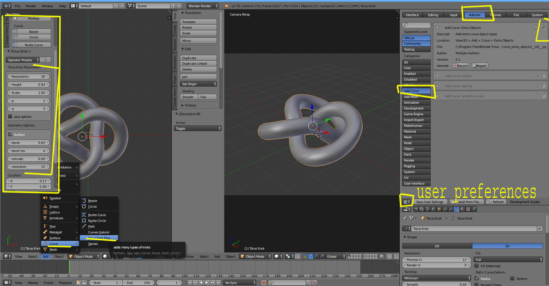 Y se añade a la escena desde Add > Curve > Torus Knot Plus