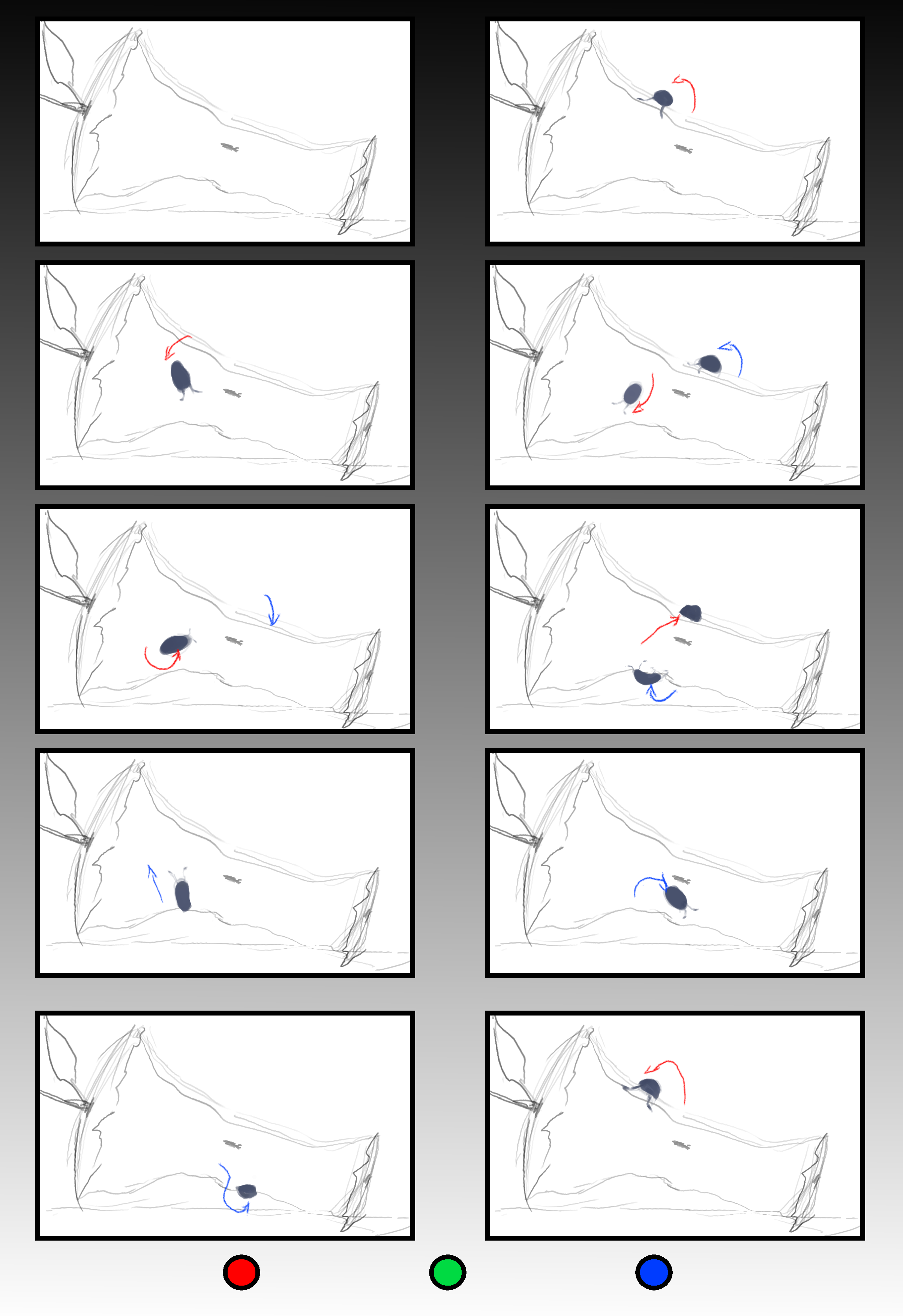 El tema de mi loop, se sitúa, sobre los restos de una manzana, donde dos jóvenes Roly polies, (bichos bolita, chanchitos de tierra, armadillos de humedad, cochinillas...) pasan el rato. Las herramientas que decidí usar para este reto son Blender, por supuesto y krita que a últimos días intento dominar, y me parece una buena oportunidad para ayudarme en ello. Dejo adjunto mi Storyboard, y un concepto de color. En el código de color de las acciones, de mi Storyboard, hay un tercer color, el verde, que no utilicé pero que esta ahí indicado por si me alcanza el tiempo, agregar un tercer elemento que dejé fuera por ahora, hasta ver como la voy librando con la realización.