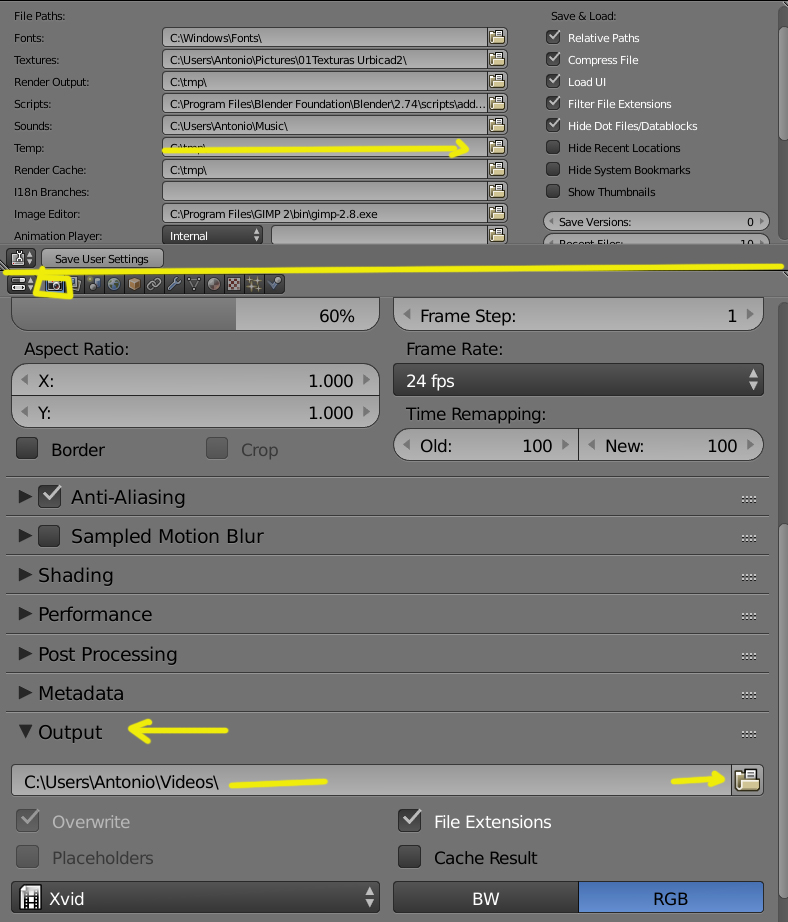 (Luego haces un GUARDAR VALORES ) Save User Settings, para que cada vez inicies blender, salga esa nueva ruta.