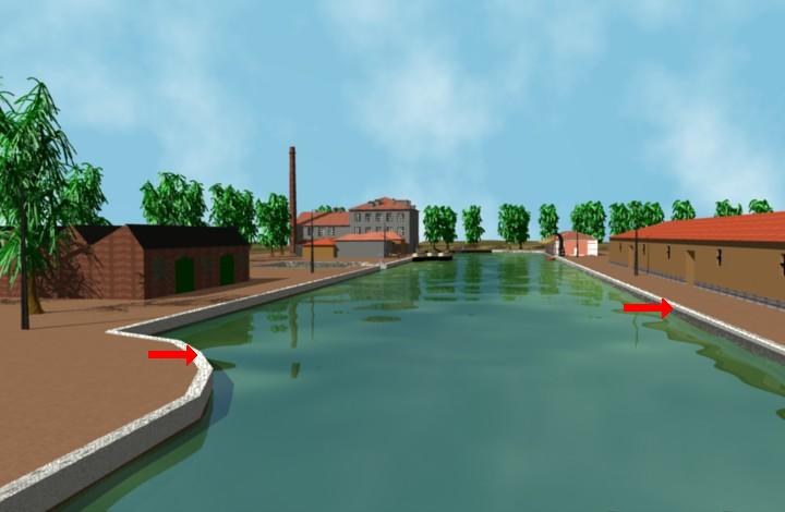 Al hacer una animación de una cámara recorriendo esta dársena de la imagen, el borde del muelle que está marcado en la imagen parpadea.
