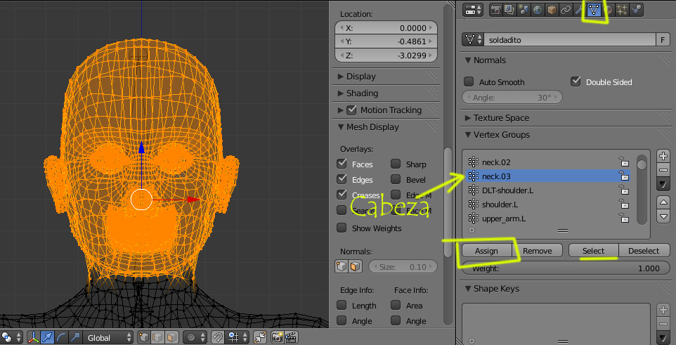 Muchas Gracias Soliman! de echo ví que algunos vértices de la cabeza tampoco estaban asignados como el mentón. Me ha servido de mucho tu respuesta así que gracias otra vez por ayudar a los novatos para que sigamos aprendiendo.