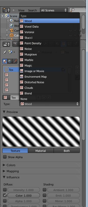 Saludos Magorumas, Blender cuenta con texturas procedurales que no son otra cosa que texturas configurables que puedes manipular cambiando diversos parámetros que contienen, en el panel texture puedes verlas y por supuesto esta la textura de madera (wood) la que a primera vista en la previsualización aparece como lineas horizontales blanco y negro. Este tipo de texturas requiere de desarrollar una particular habilidad de reproducir el entorno combinando los parámetros de una o más texturas procedurales, cosa que se logra con el tiempo y practica, mientras tanto puedes elegir cargar imagen o archivo y usar una textura fotográfica de una referencia de madera real, que es más sencillo por ahora.