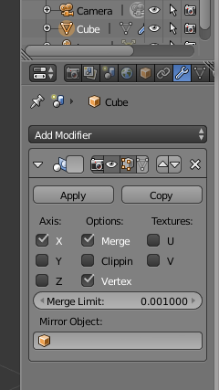 D4rB escribió:No, el Mirror o Espejo es el modificador que usaste para modelar solo un lado y que se replique al otro, sin embargo al estar replicado lo que hagas en un lado al otro le sucederá también, necesitas aplicar el modificador para que el reflejo que estaba haciendo se haga "real" y puedas usar cada lado de manera independiente. Para aplicarlo hay yun botón en el panel del modificador, justo donde lo agregaste.