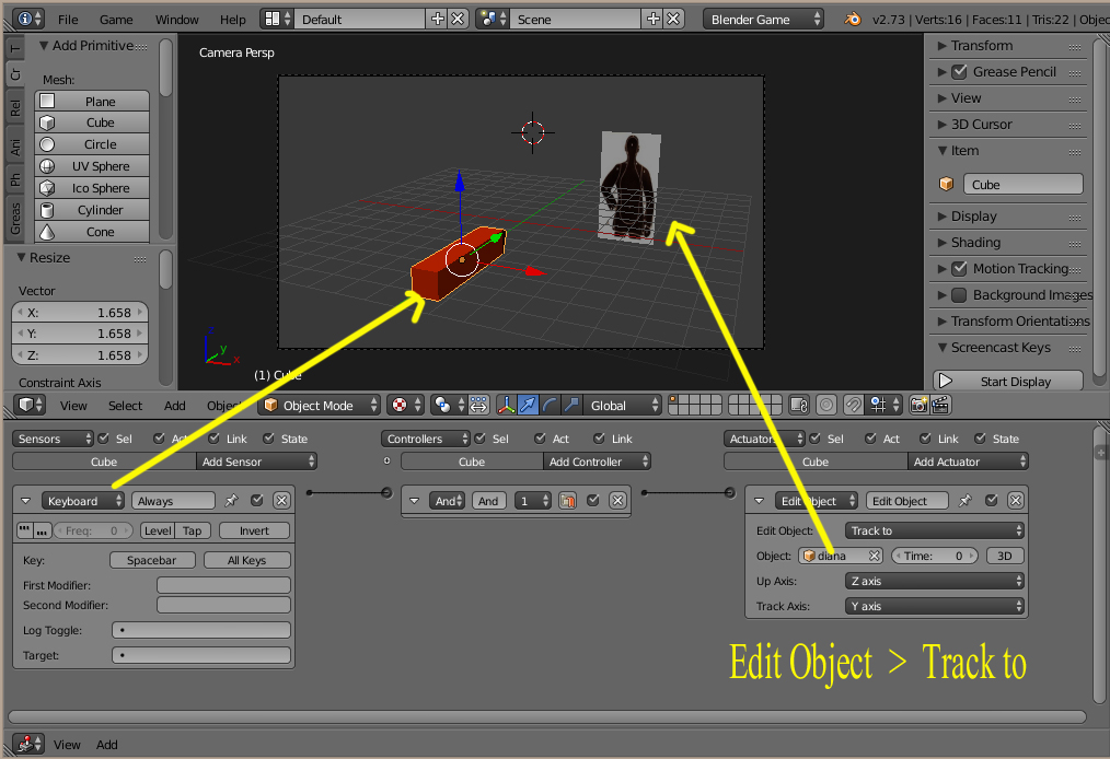 En cuanto a que al hacer algún disparo apunte hacia un punto en concreto (en este caso la diana) hay un ACTUATOR llamado Edit Object que tiene una opción llamada TRACK TO (apuntar a) y donde solo tienes que poner el nombre del objeto (diana en este caso) y mirar si las coordenadas te coinciden y ajustarlas.