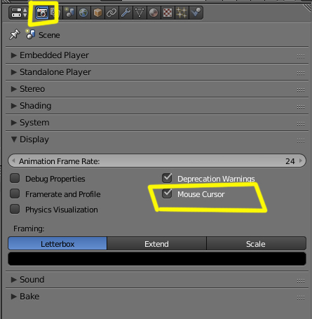 Para esto lo primero que necesitaba era ver el cursor y por ello usé el editor de texto y enlacé el siguiente código a un objeto con sensor always unido a controller a python: