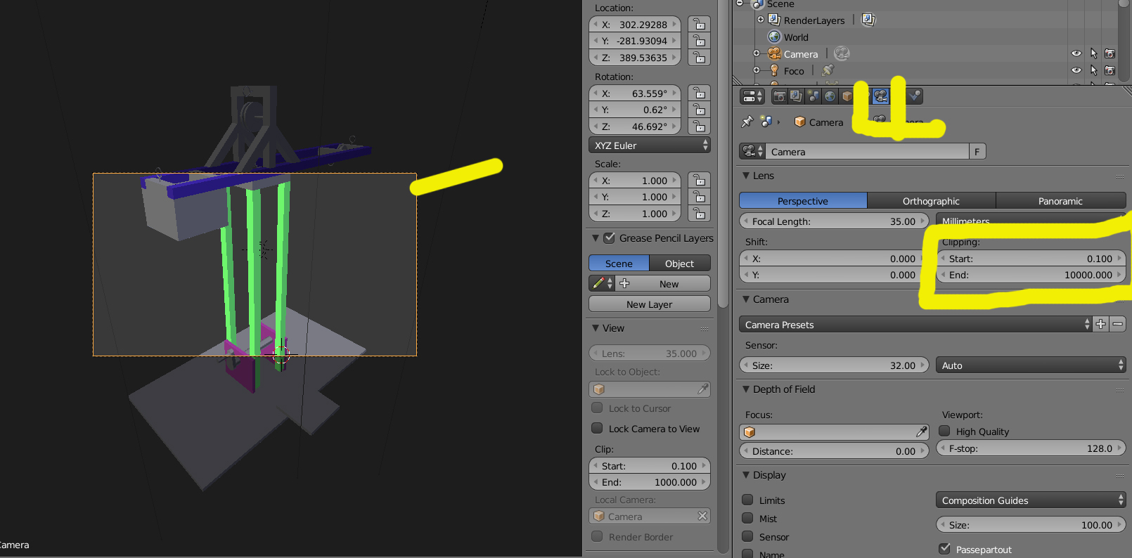 Tienes la escena con los objeto muy grandes y la cámara tiene un enfoque muy corto.
