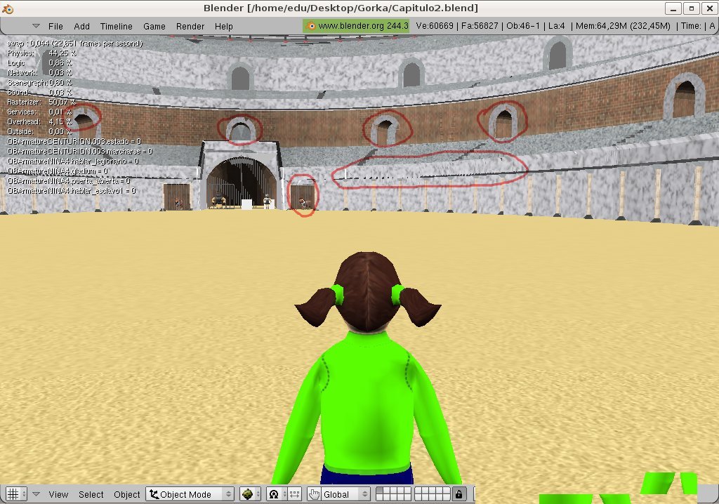 Les dejo una imagen de una captura de un videojuego que estoy desarrollando actualmente. Como se puede ver, aunque la captura de pantalla tampoco es una maravilla, algunos objetos que ciertamente estarán aproximadamente a una distancia de unos 150 medida blender, se ven de una manera un poco rara. El tema es que cuando me acerco se ven correctamente, y la verdad, no creo que se deba a ninguna técnica \"level of detail\" ni nada por el estilo. Más bien creo que es un problema de las texturas y las caras, que se cruzan de tal manera que hace un efecto raro o algo por el estilo, cálculo de visibilidad, algo así.