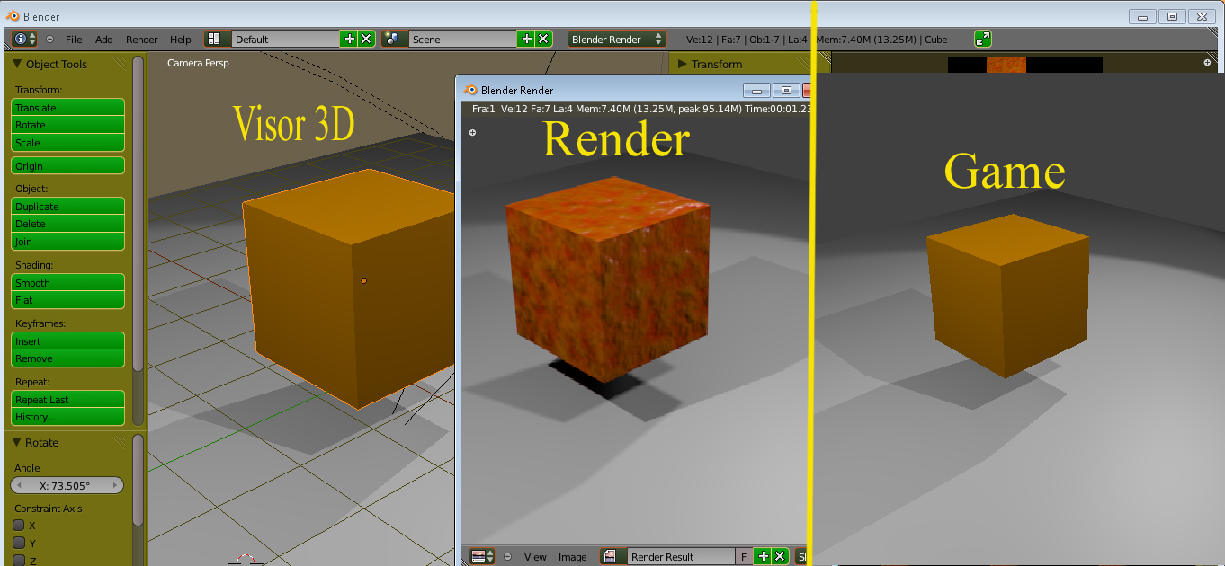 En la 1ª imagen (textura procedural clouds) se ve lo que nosotros vemos en pantalla, lo que vemos cuando hacemos un render y lo que veríamos si entráramos en el Game