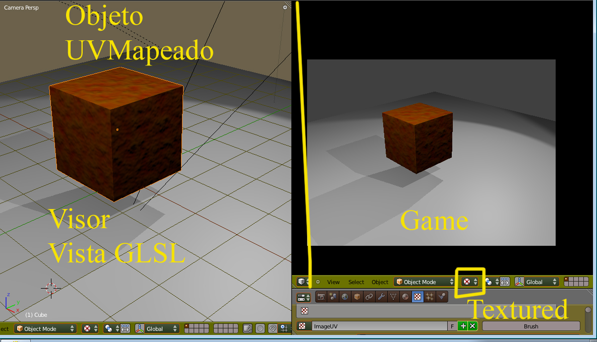 En la 3ª imagen, se ve el objeto con la textura UVMapeada y con vista en GLSL y como se vería en el Game (ya se ve el clouds)