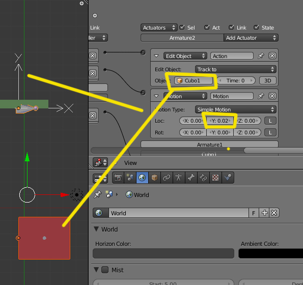Tengo un problema con el track to. Lo que quiero es que un objeto se dirija a otro. Para ello pongo dos actuadores, uno de movimiento y el otro un edit object con la opción track to hacia el OB al que quiero que vaya. El problema es que el objeto, en vez de girarse hacia el OB que le asigno, hace lo contrario y mira hacia el otro lado, y por lo tanto se aleja. Hay alguna forma de arreglarlo? Los objetos son armaduras, no sé si tiene algo que ver con eso.