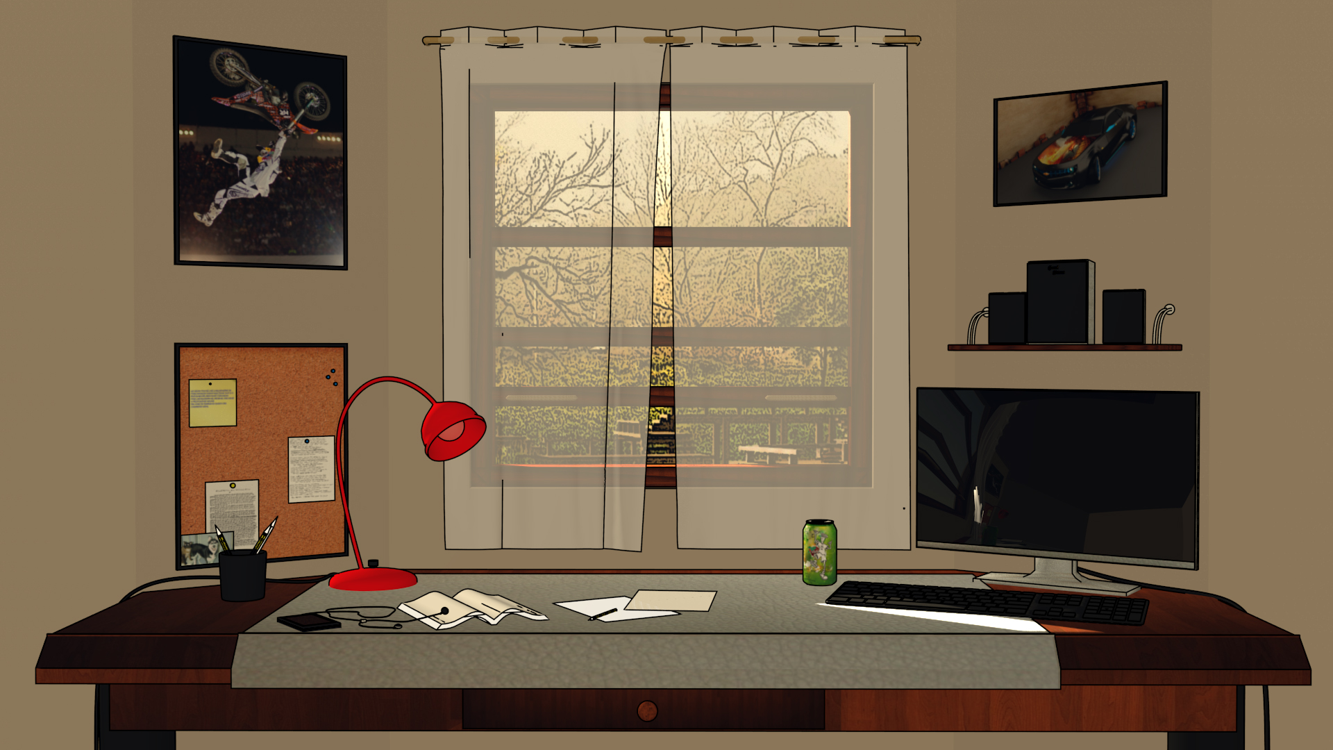 En fin a lo que iba, tengo una lampara del tipo sol que incide contra los cristales de una ventana, pero aunque sobre la mesa (justo encima del teclado), se ve una franja de lo que sería la luz del sol, hay objetos que simplemente por la luz ambiental dentro de la habitación, deberían proyectar una sombra (ver lata de refresco junto al monitor).