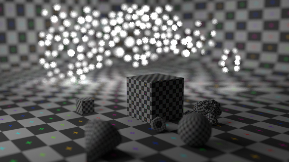 Sí, tienes objetos a los que iluminar, pero el poner esferas u otros objetos pequeños cerca de las lamparas es para que esto queden fuertemente iluminados y al desenfocar parescan lámparas, te dejo una escena de ejemplo que acabo de hacer.