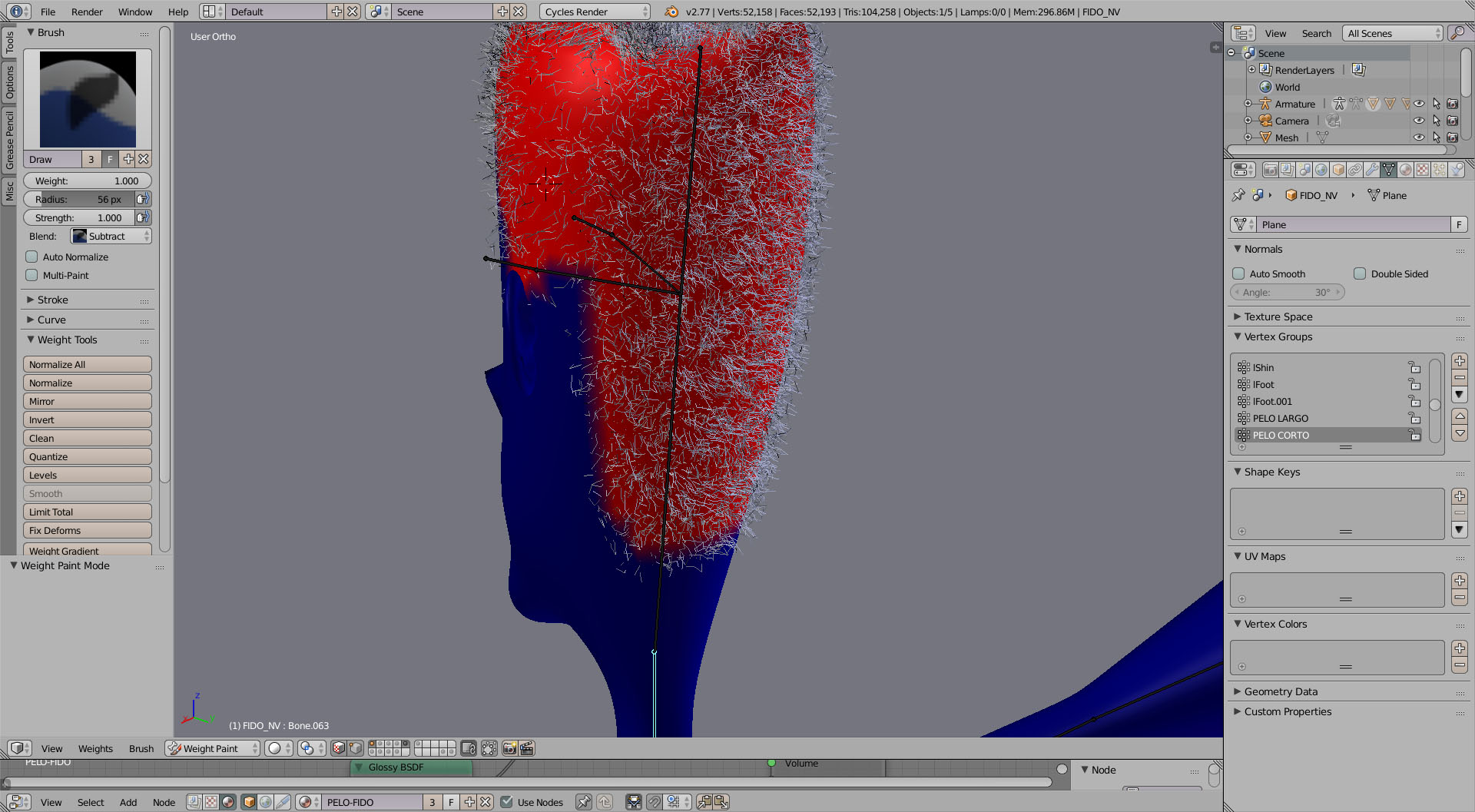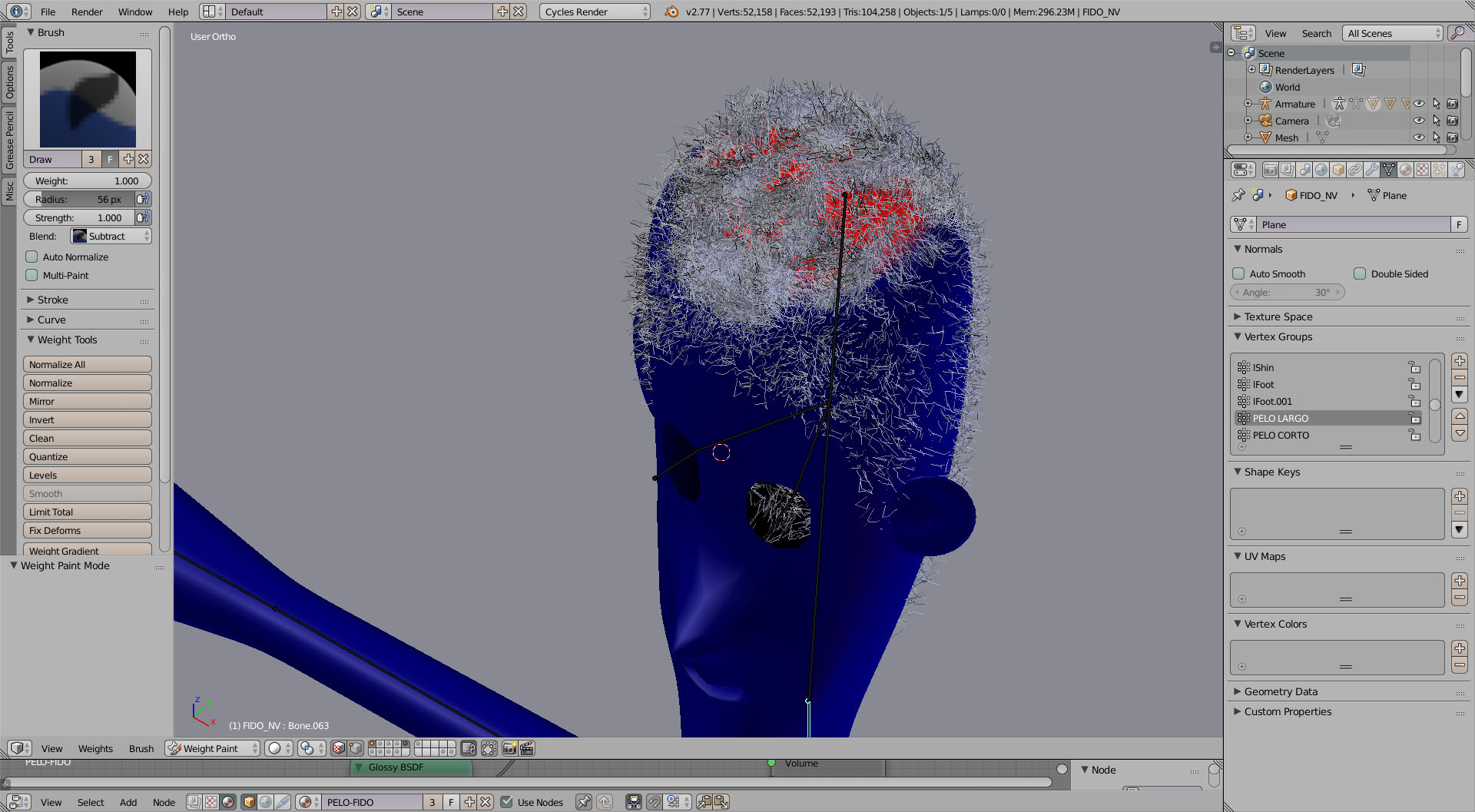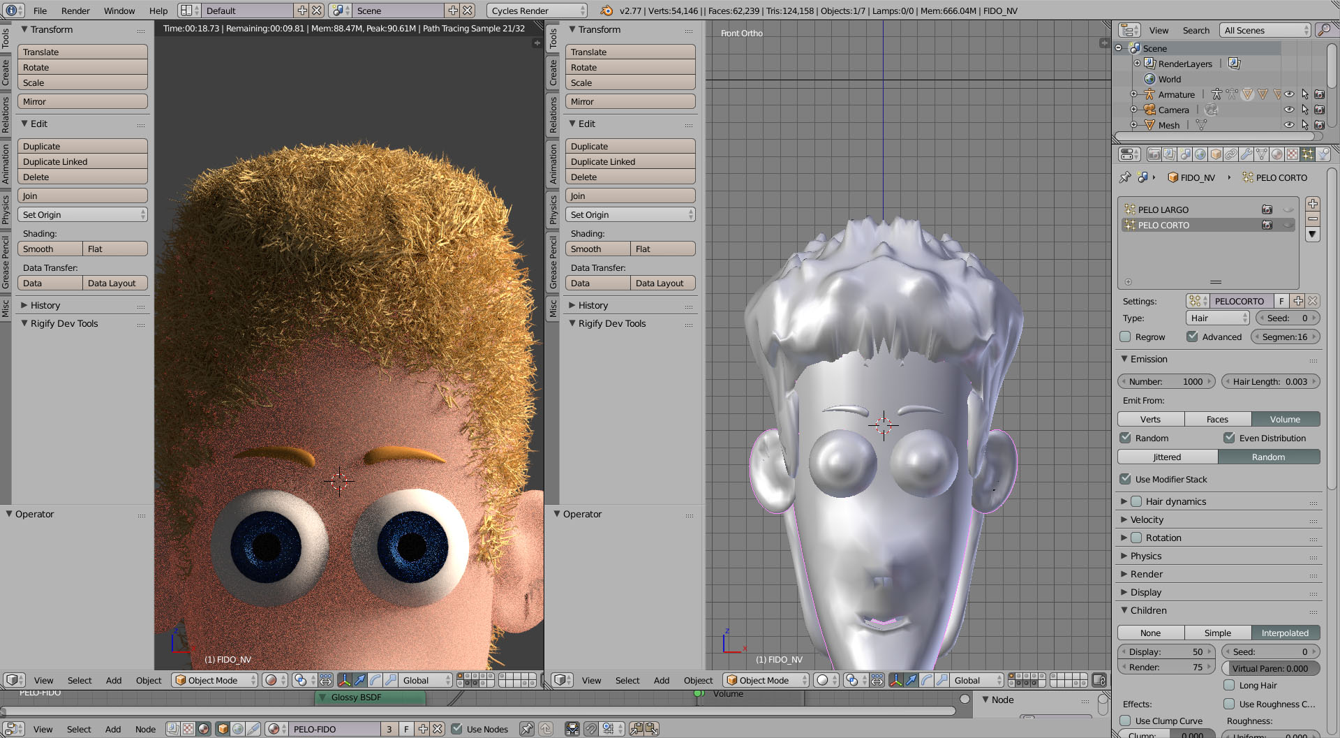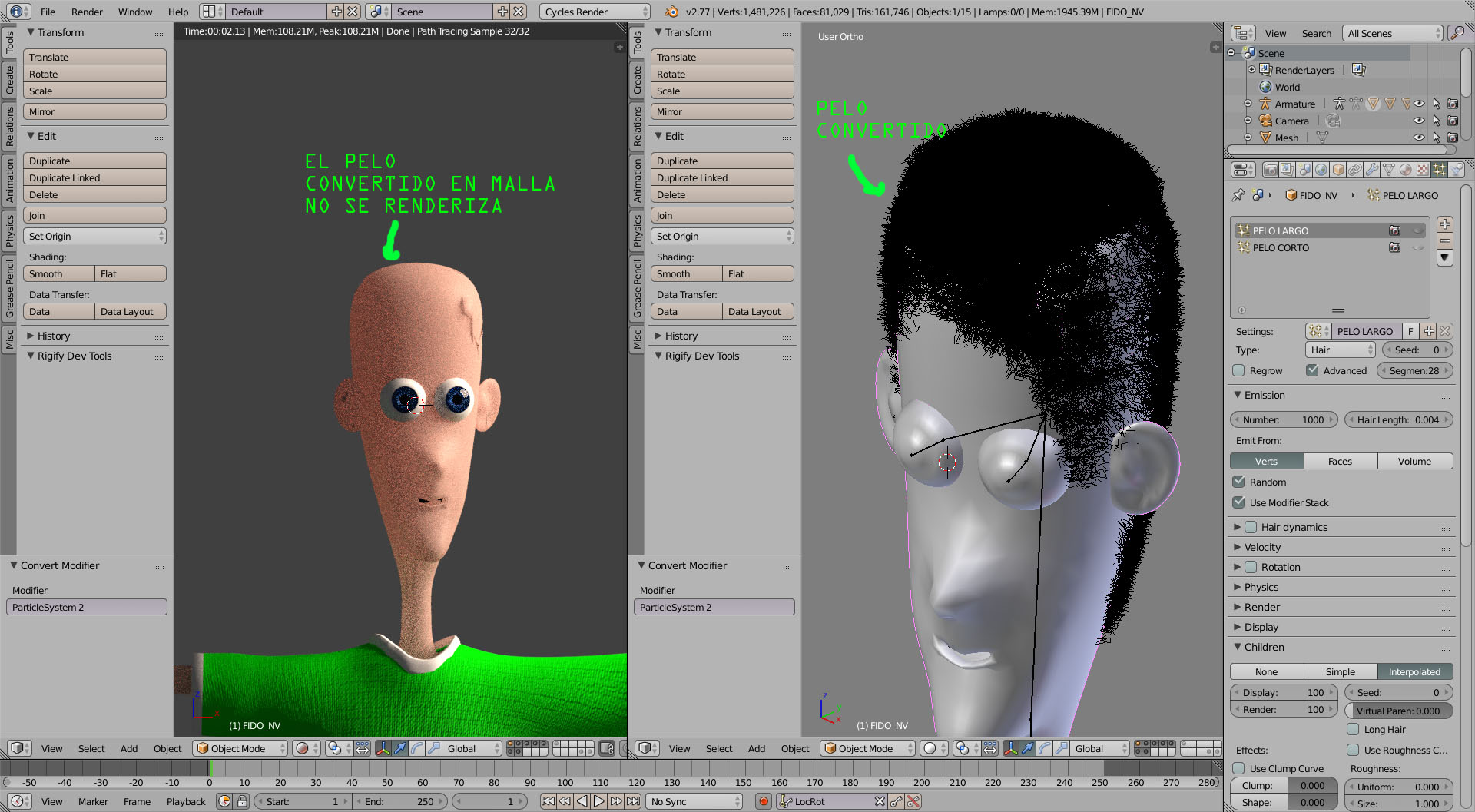 Hola, he cambiado el orden, he puesto el esqueleto arriba, luego abajo etc y no consigo renderizar el pelo, de todos modos... cuando he convertido el pelo a malla, el numero de vertices supera el 1000.000 así que me estoy planteando usar una esfera y esculpir el pelo a menos que no sea necesario convertir las particulas y pueda animarse junto al resto del personaje. ¿puede hacerse?