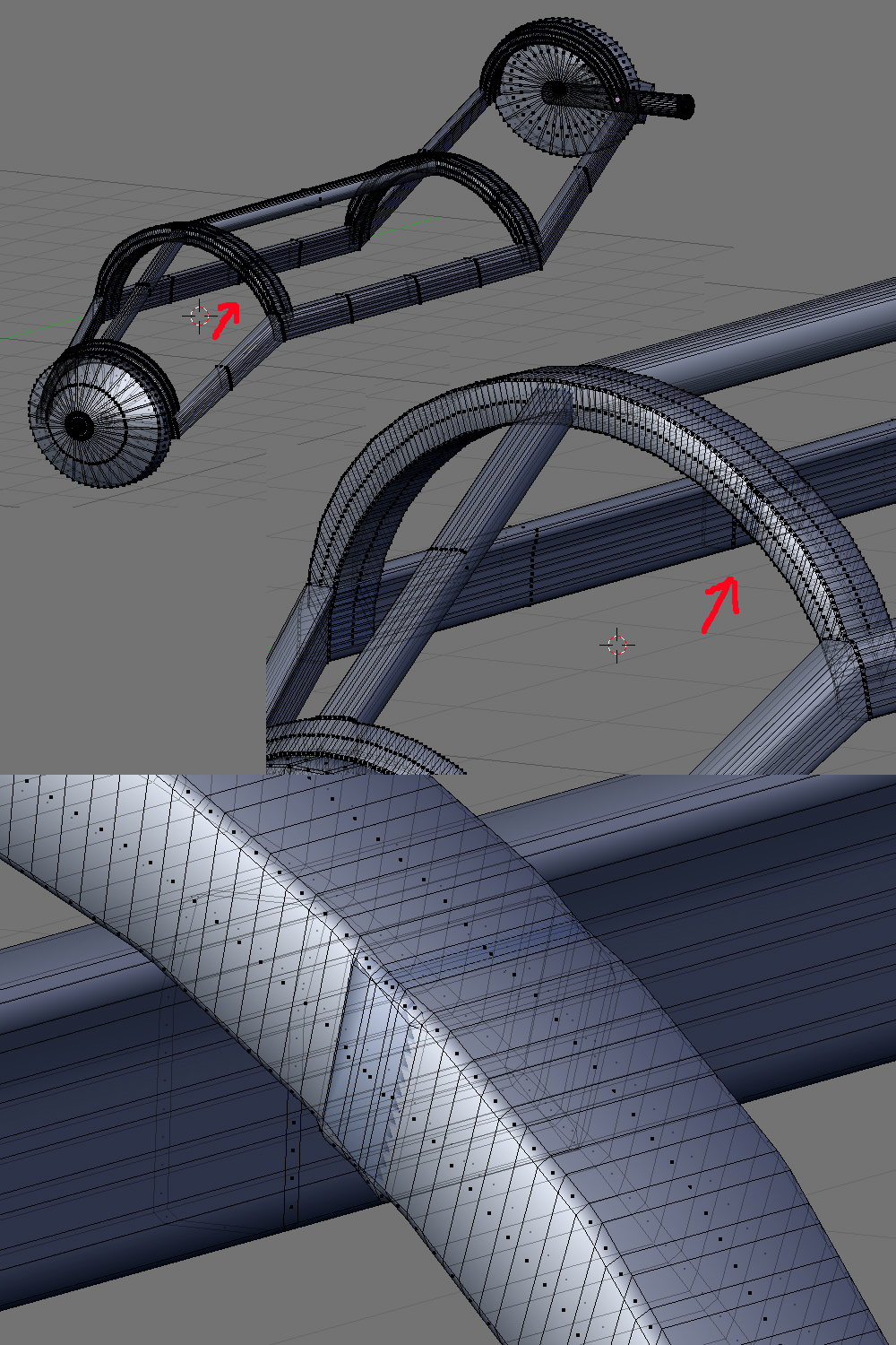 Hola tienes razon en la parte metalica tengo un problemilla que ademas no consigo solucionar correctamente y no se cual es el origen del fallo porque esta parte la hize extruyendo, como el resto del armazon. Pongo unas capturas de la malla en la que se ve el problema.