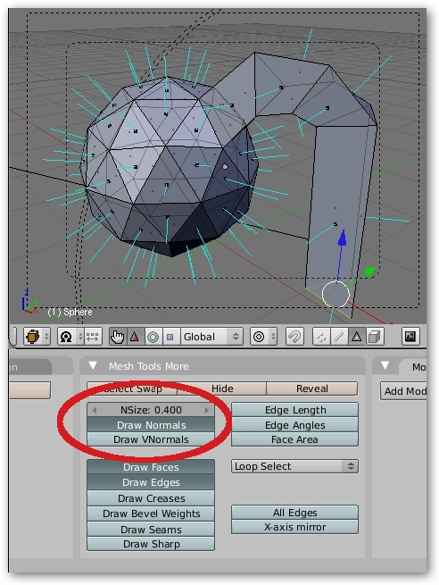 Se pueden hacer visibles las direcciones de las normales, controlar el tamaño de su aspecto y en modo edición las faces seleccionadas pueden invertir su dirección utilizando la tecla \"W\", y eligiendo \"flip normals\" en su menú desplegable.