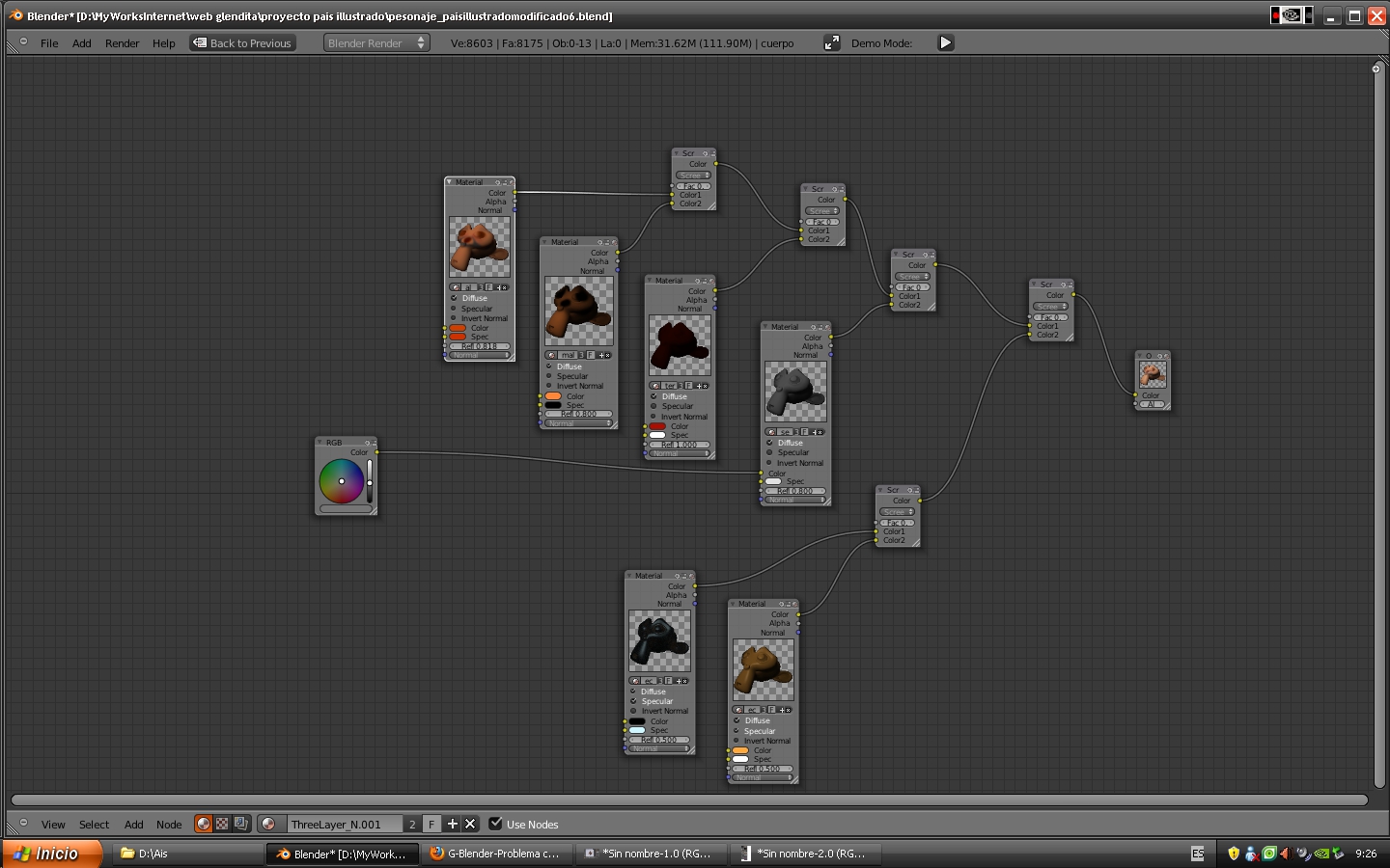 otra cosa, es necesario tanto nodo? lo pregunto porque con tanto efecto se hacer increiblemente lento el render (como 4 minutos) y talvez optimizando y jugando se logre algo parecido en menos tiempo,