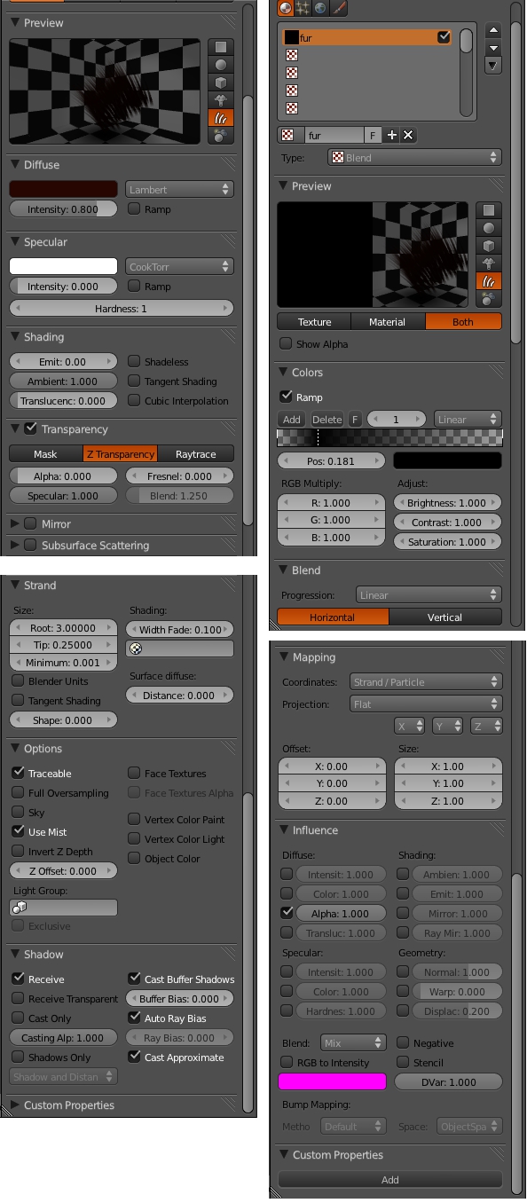 estas son las imagenes, de la configuracion del material con SSS y el de las particulas tipo hair... no se si hay algun error.