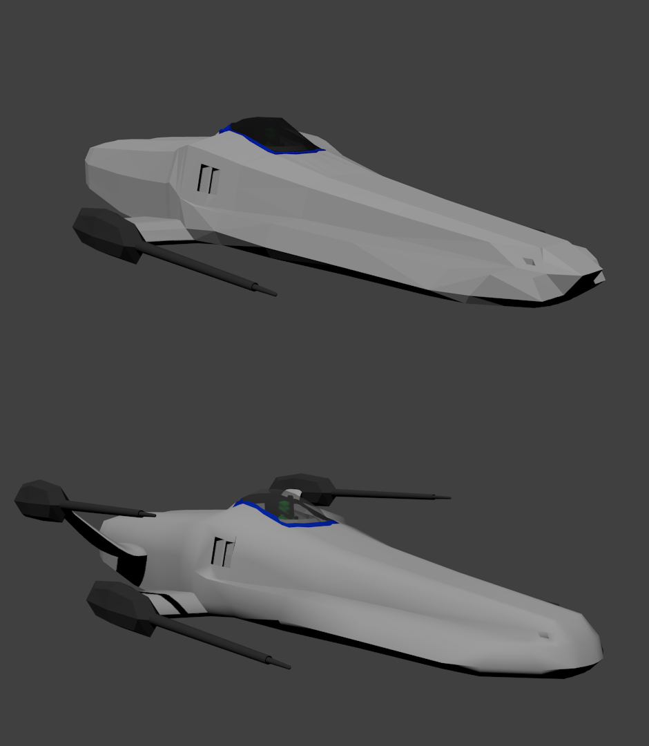 Hace tiempo que inventé unas naves en origami, y quería darles un aspecto \"más realista\" y en esto ando con mi primer proyecto blender en los ratos libres, eso sí, a pelo, sin croquis (que dibujo muy mal) ni nada, solo con las figuritas de papel 8-) . Ando peleándome con la cabina, porque por algún motivo que este novato no comprende, no se transparenta, es decir, no se ve lo de dentro, es decir, lo que está detras del cristal, sin embargo en otros archivos que he creado siguiendo los tutoriales que pululan por la red, si se vé el objeto de detrás. Bueno al grano, ¿que os parece la nave? Bueno en realidad es la base, ya que las tres comparten la misma :-)