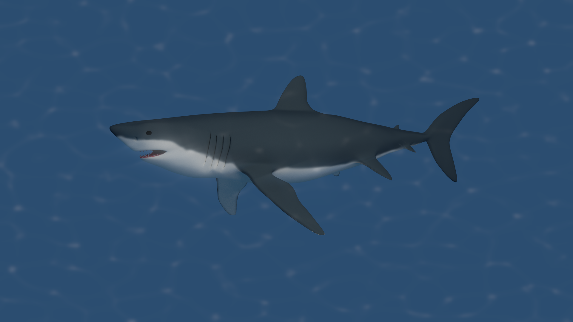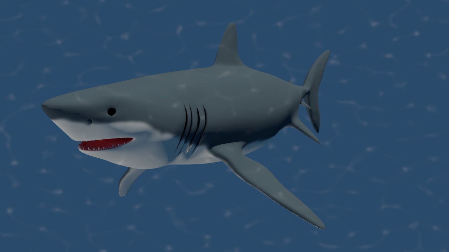 Hola va quedando muy bien, Yo hice un tiburón zorro hace ya algunos años y usé la textura animada de las causticas proyectadas desde las luces (Lamp) y me dio un buen resultado entonces. Aquí esta la animación. Quizá te ayude la misma técnica a darle vida a tu tiburón blanco.