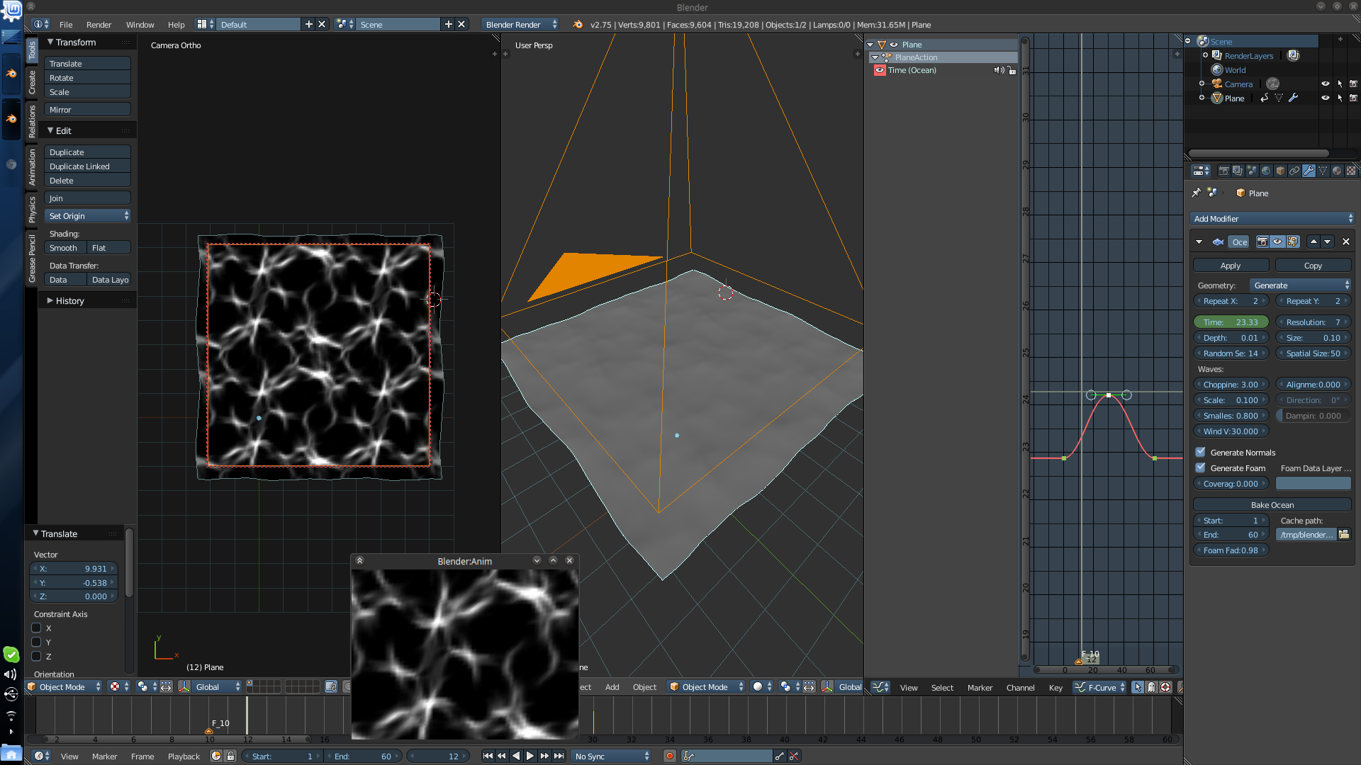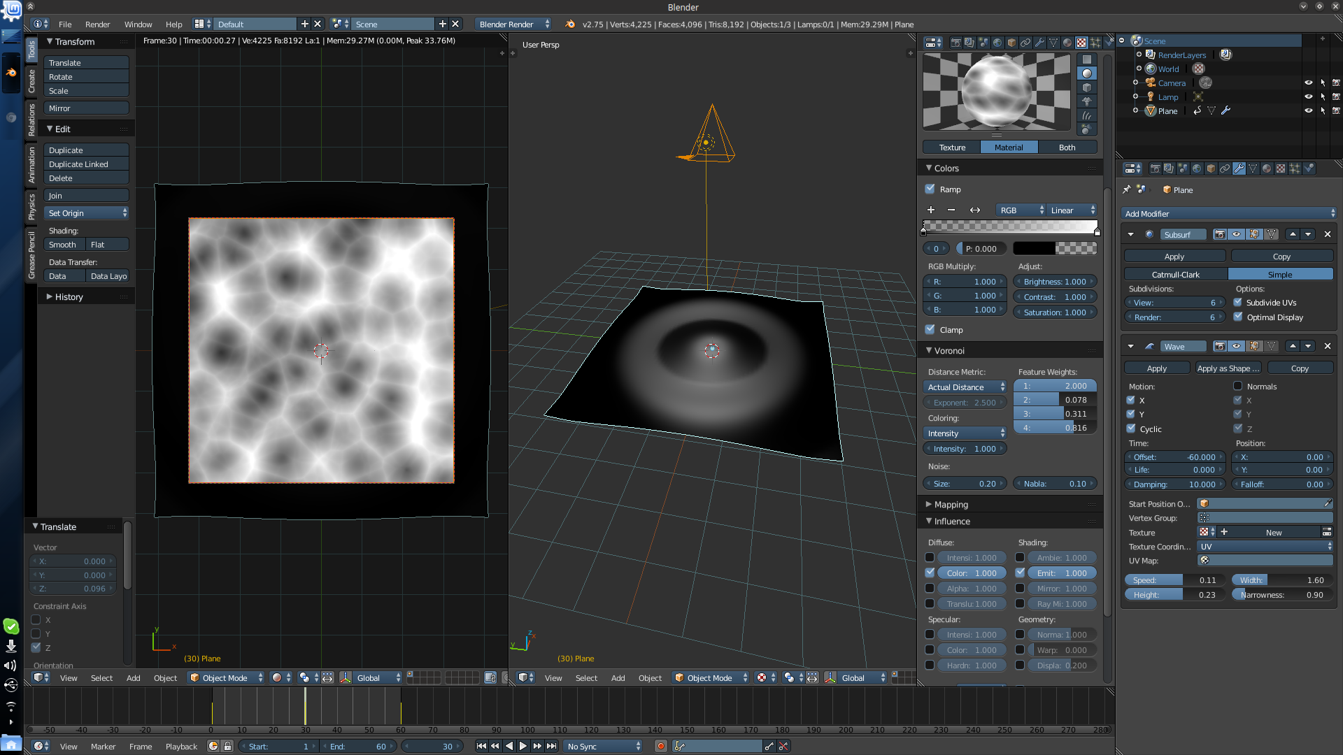 En ese entonces usé una textura en un plano y lo anime con hooks, me parece. Pero, eran otros tiempos créeme no quieres hacer eso. :P Ahora tienes un montón de modificadores que te pueden ayudar, usando esa misma textura Voronoi que tienes ahí, cómo el Wave modifier o el ocean modifier, ¿Qué mejor?. Incluso puedes usar hasta el de simple deform para animar tu textura sin usar cycles.