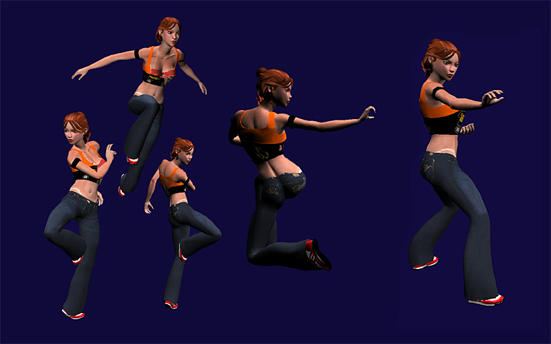 Para hacer la animación del salto, utilicé como base una secuencia de captura, pero tube que hacer muchos ajustes a mano para conseguir que se viera real la reacción del impulso.