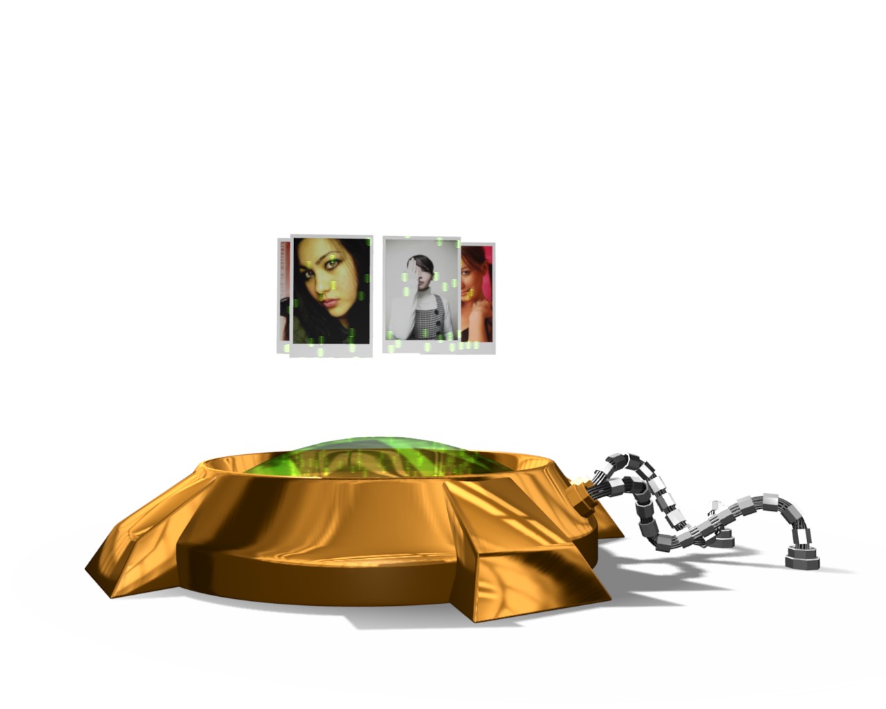es que estoy creando una escena donde hay un aparato que proyecta unas imagenes tipo holograma,, todo va bien hasta la parte en donde es proyectada mi imagen; quiero que salgan luces desde el lente.esto es lo que llevo hasta el momento...