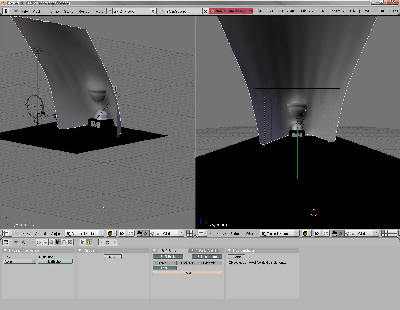 hola soy algo novato en blender ya tengo como 3 o 4 años usándolo pero en cosas muy simples, pero ya estoy entrando en cosas más complicadas, en fin, estoy animando una cortina y detrás esta una copa de un trofeo de fut, y quiero que esa cortina que asemeja a una bandera descubra la copa, ya logre hacer el viento la bandera la copa, pero cuando se mueve para atrás traspasa la copa y no quiero eso, quiero que sea natural como si de verdad estuviera y no hace eso la cortina, la copa esta modelada en 8 partes la copa es una, el pedestal otra, las agarraderas son tras y las letras están separas también haa y la placa, me puede ayudar.