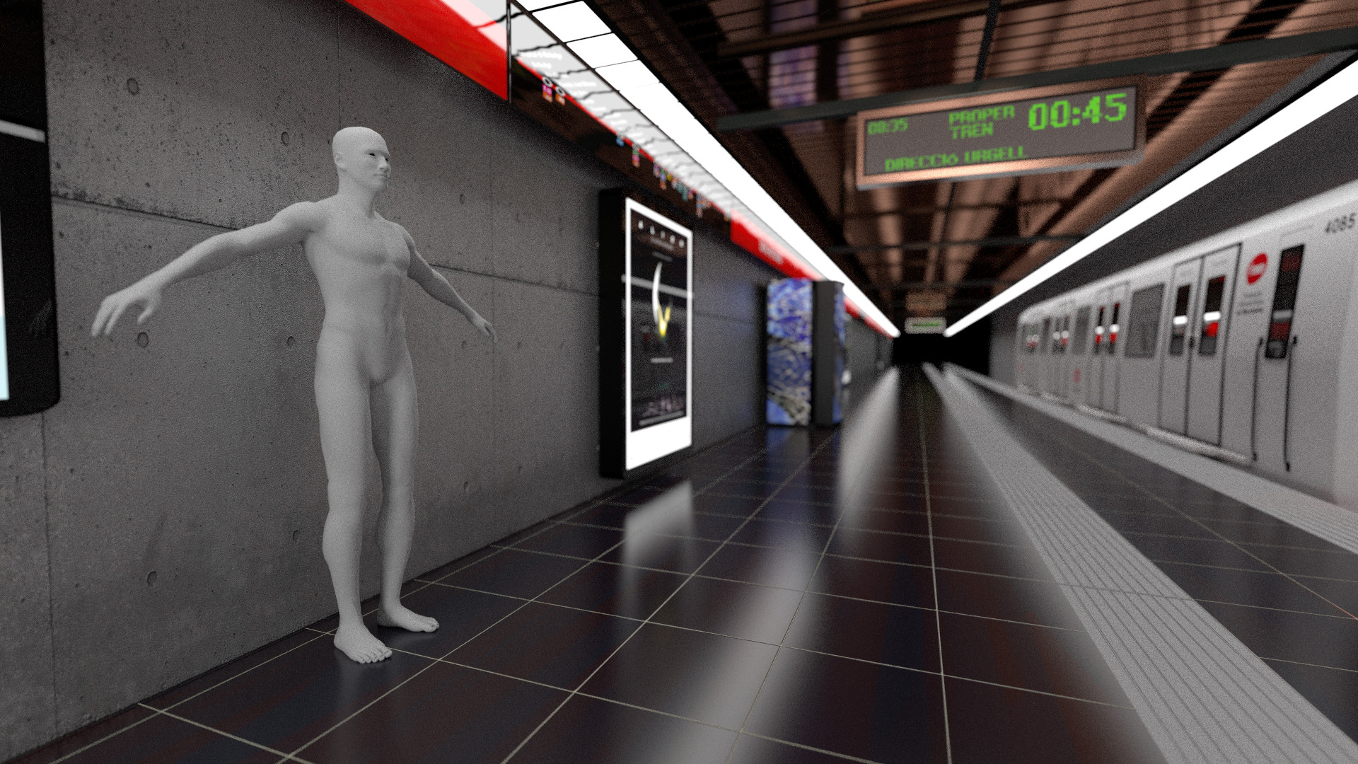 Bueno, el andén esta bastante bien, el color del vagón supongo que lo has dejado blanco por algún motivo.. si fuera una escena fotorrealista le tendrías que poner mas colores y un poco de suciedad...