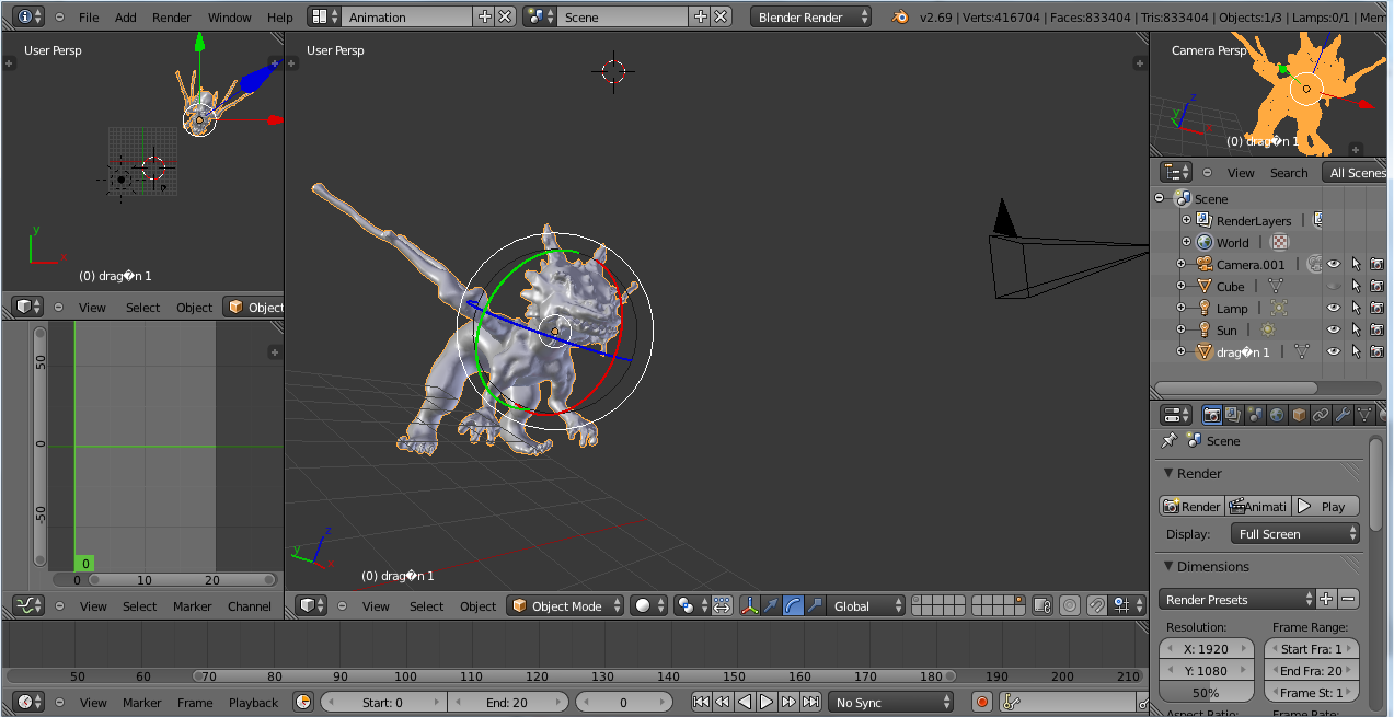 hace tiempo que me he dedicado a modelar un dragón para luego animarlo , todavía le faltan partes, pero me gustaría ir viendo el resultado de una animación de las diferentes partes y no se como asignarle los huesos.